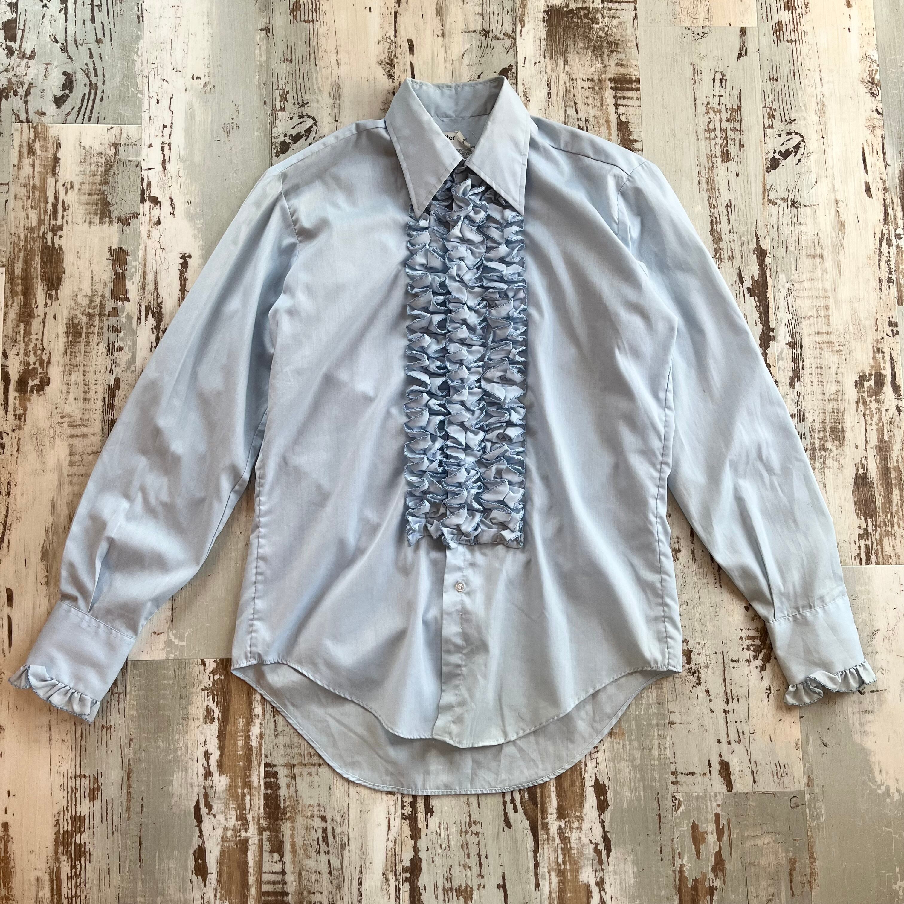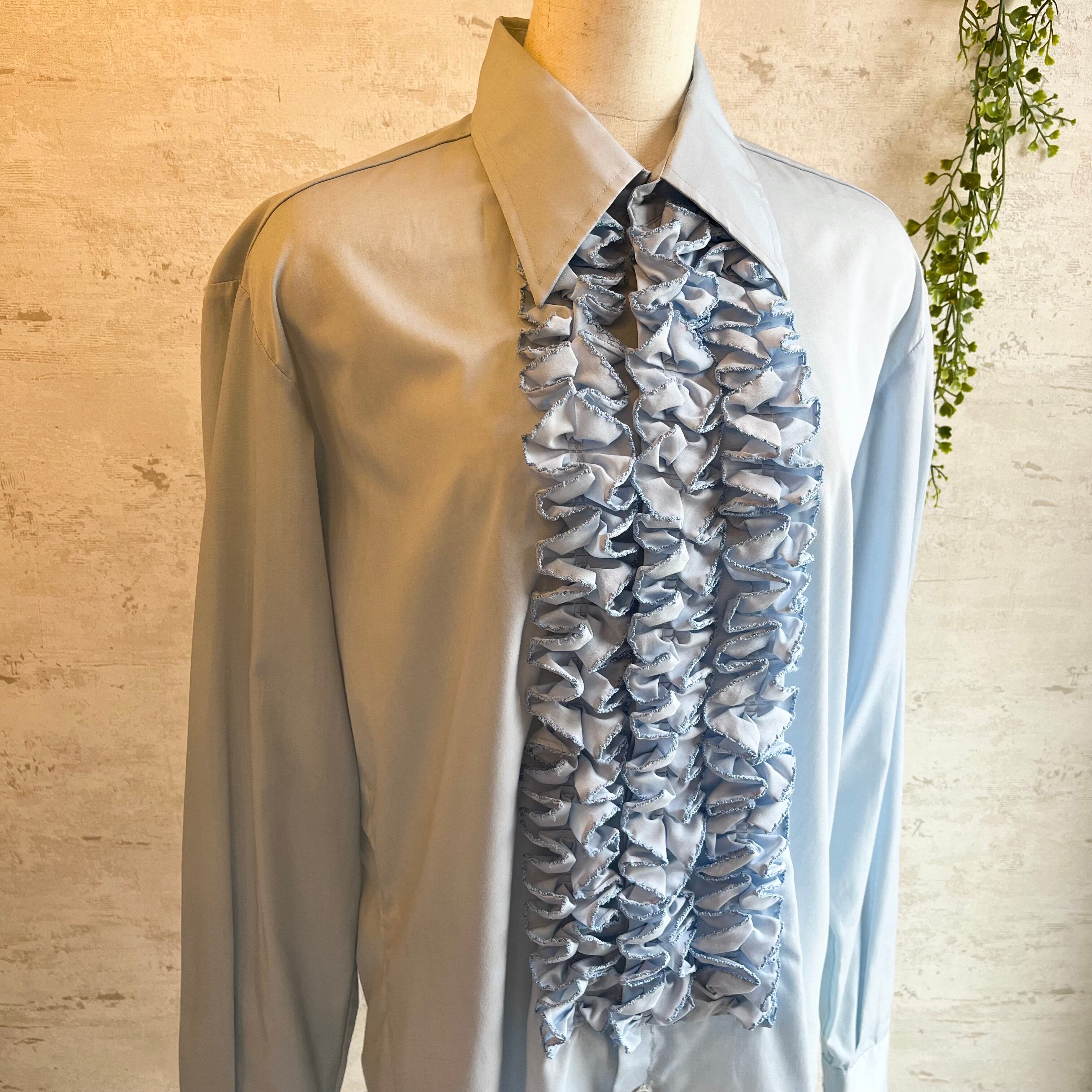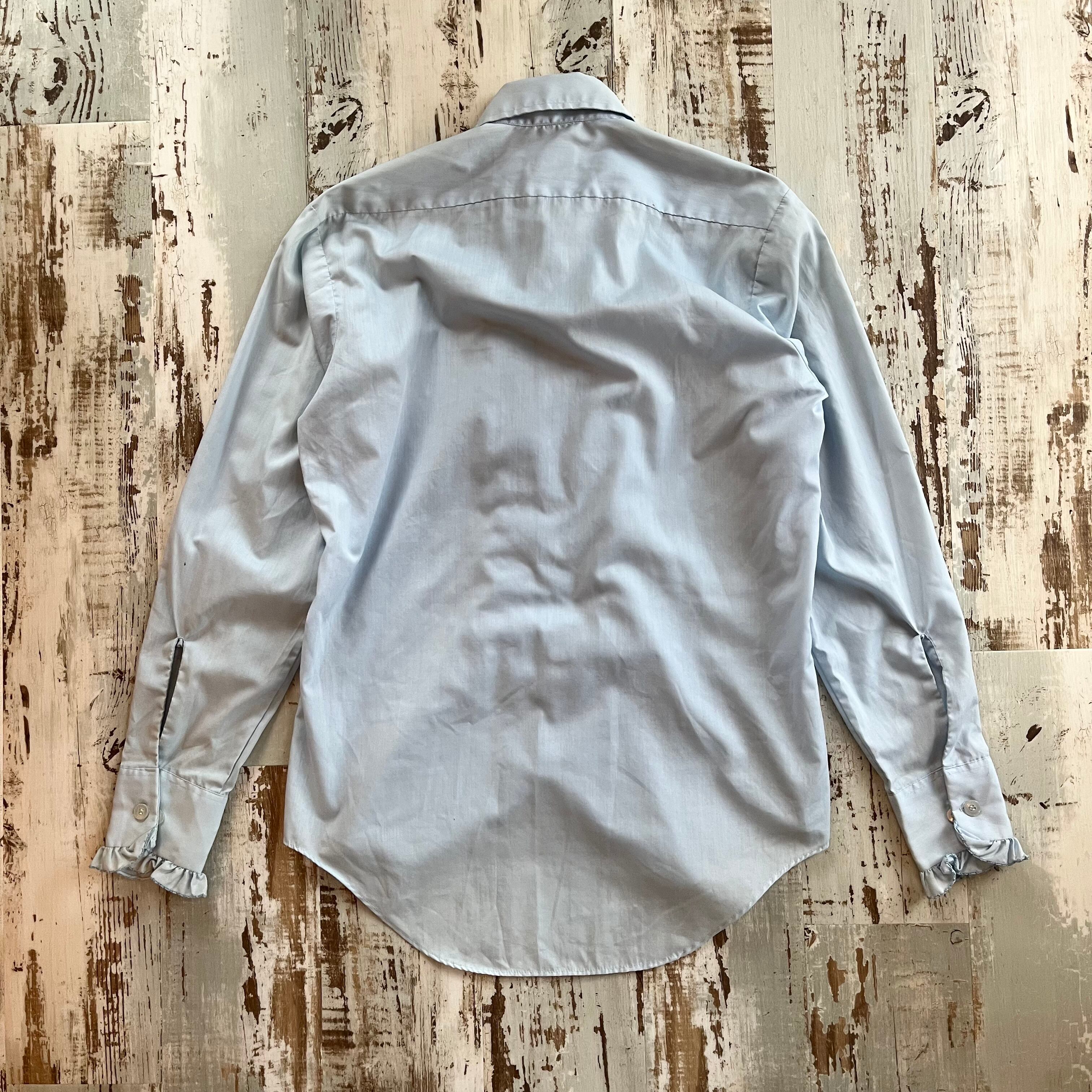 こちらは70年代〜80年代頃のドレスシャツでございます。襟芯の入った直線的に大きな襟と、フロントの大ぶりのフリルが印象的なデザイン。