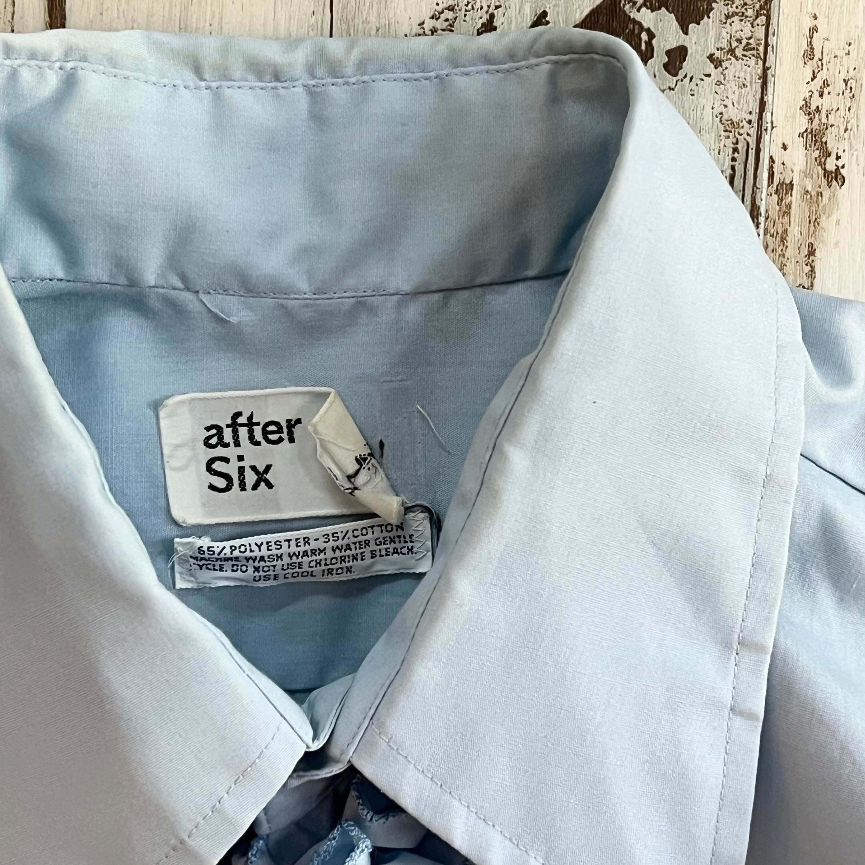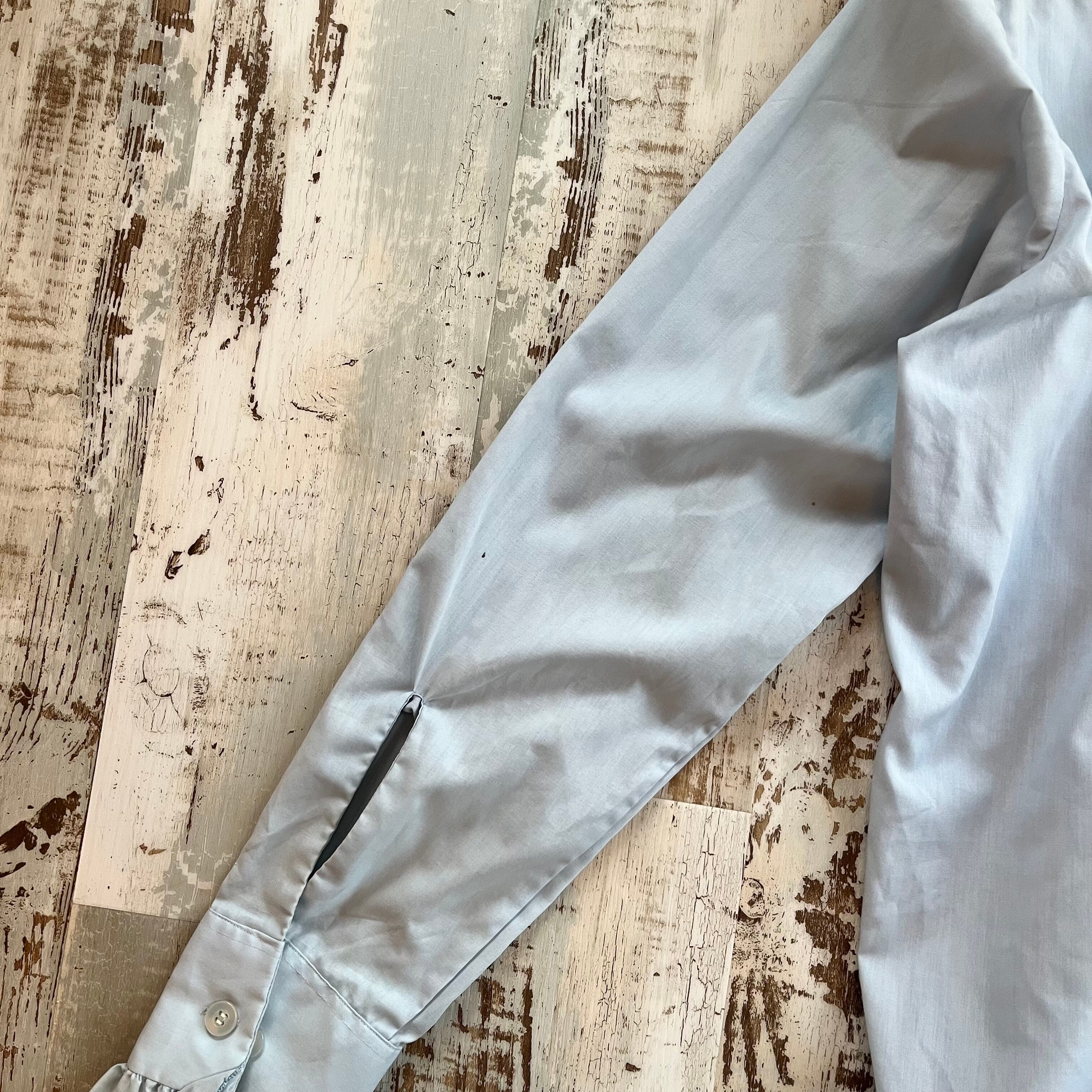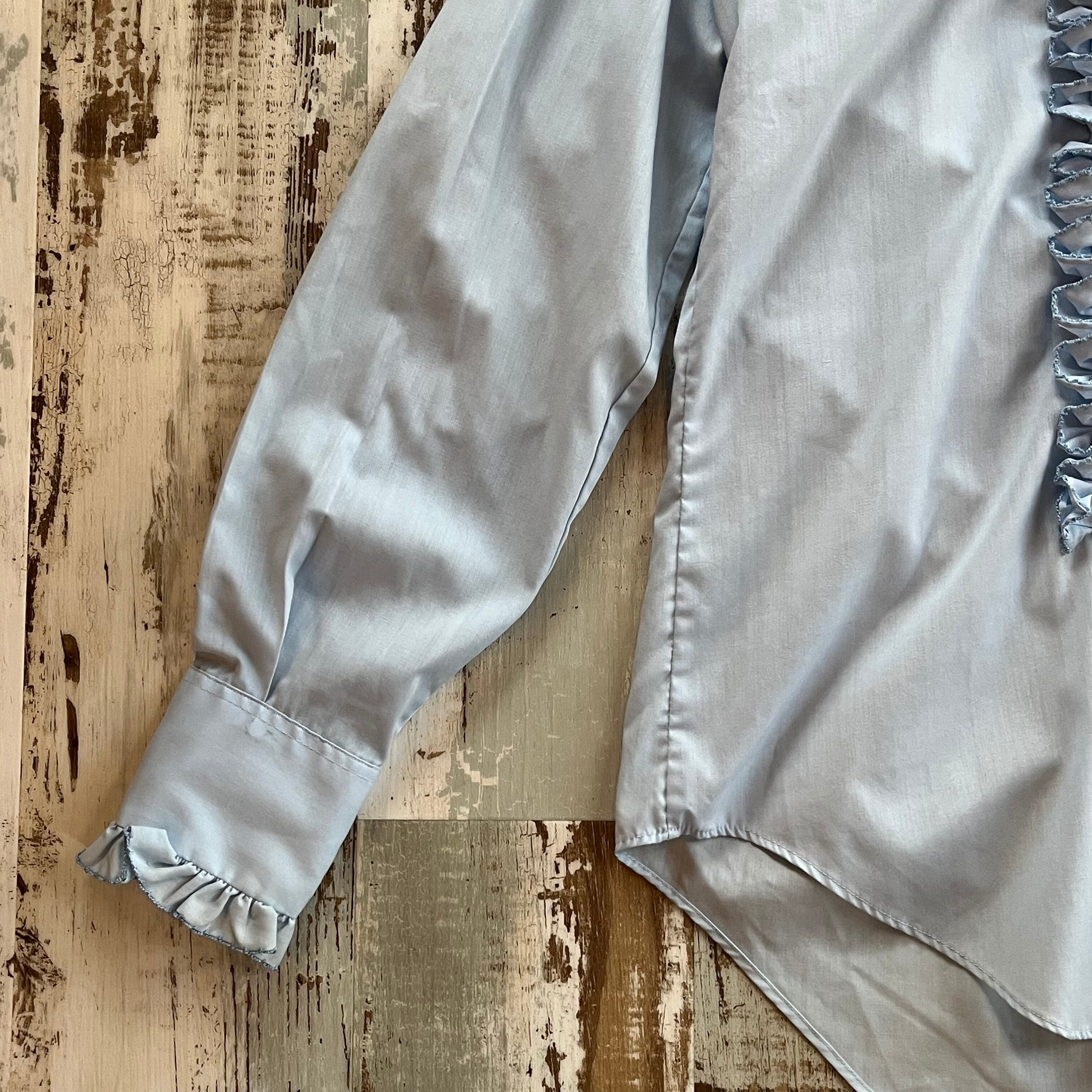 こちらは70年代〜80年代頃のドレスシャツでございます。襟芯の入った直線的に大きな襟と、フロントの大ぶりのフリルが印象的なデザイン。