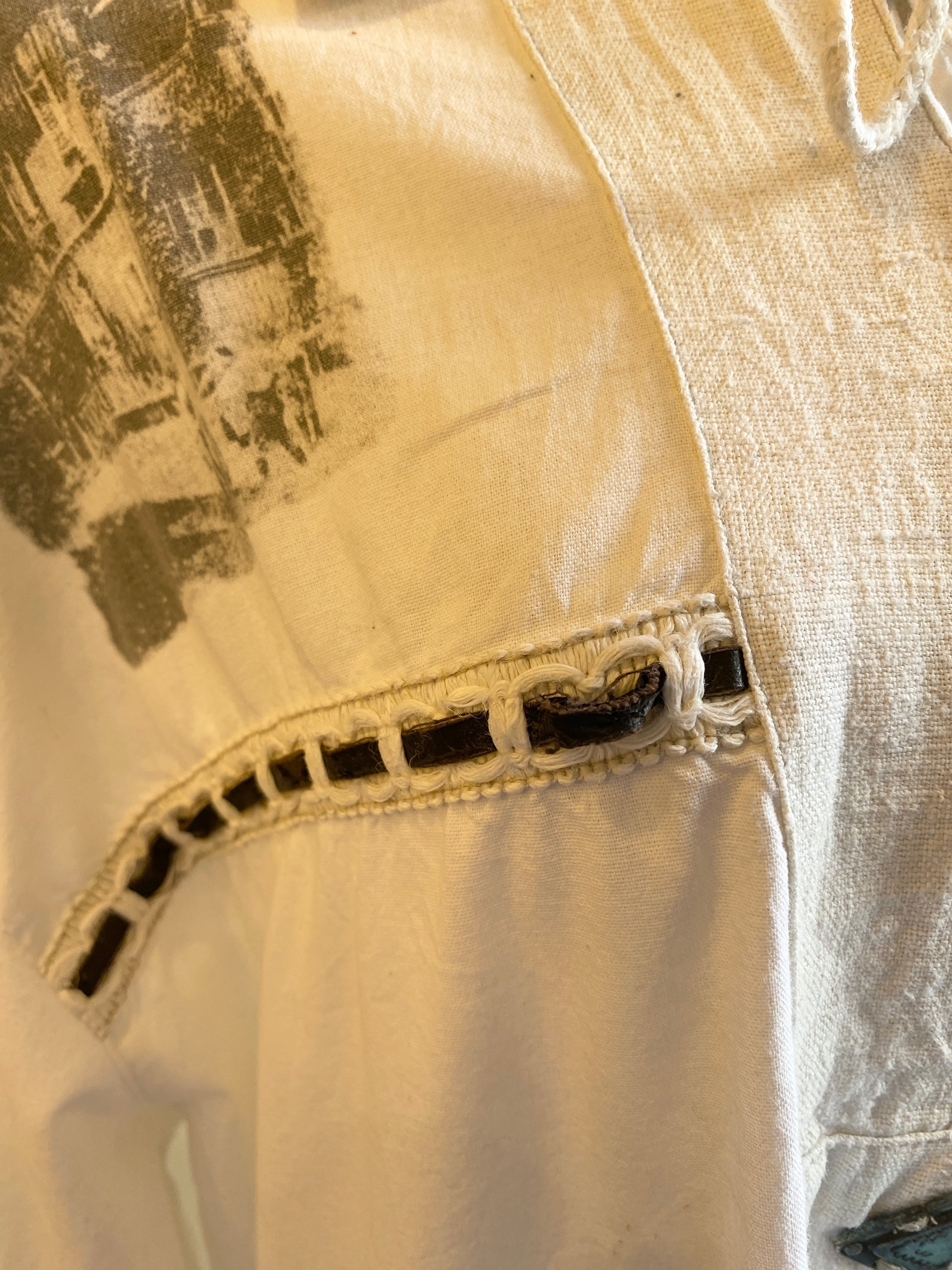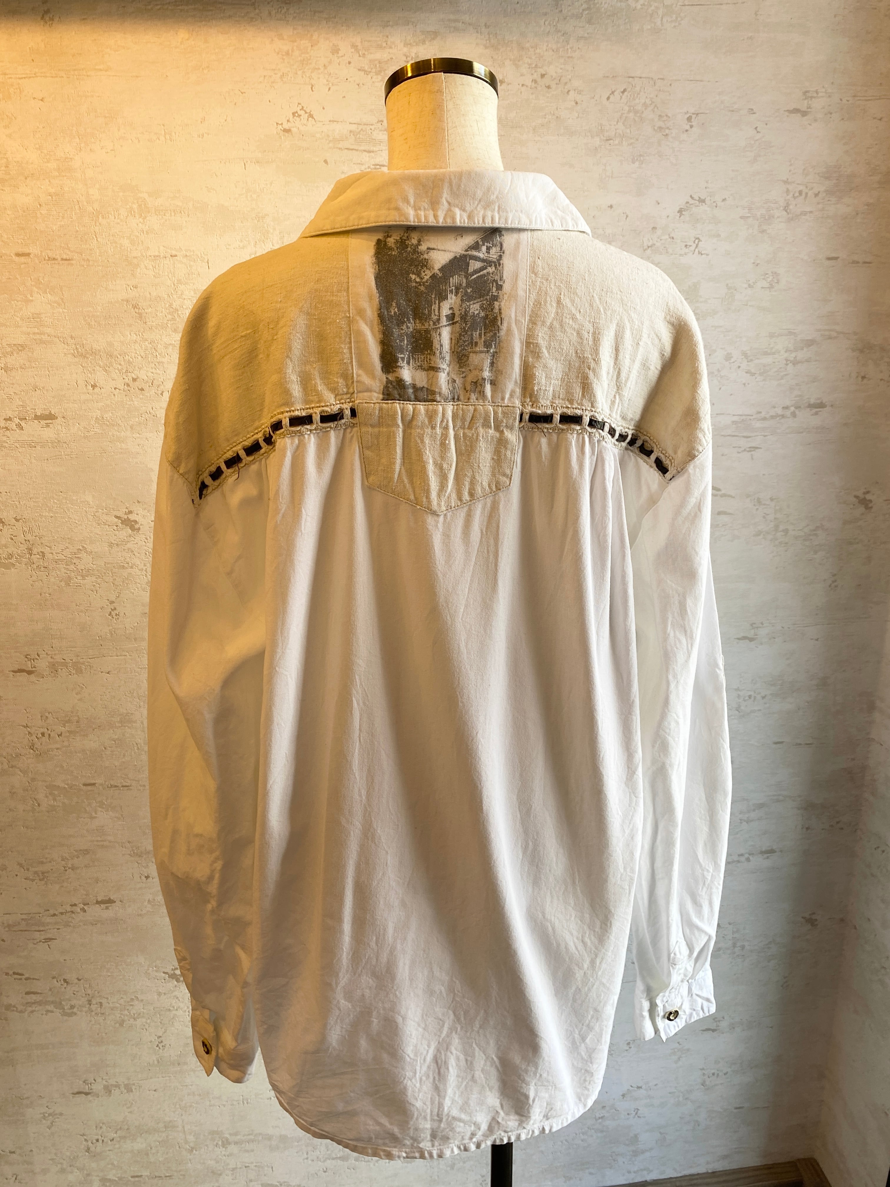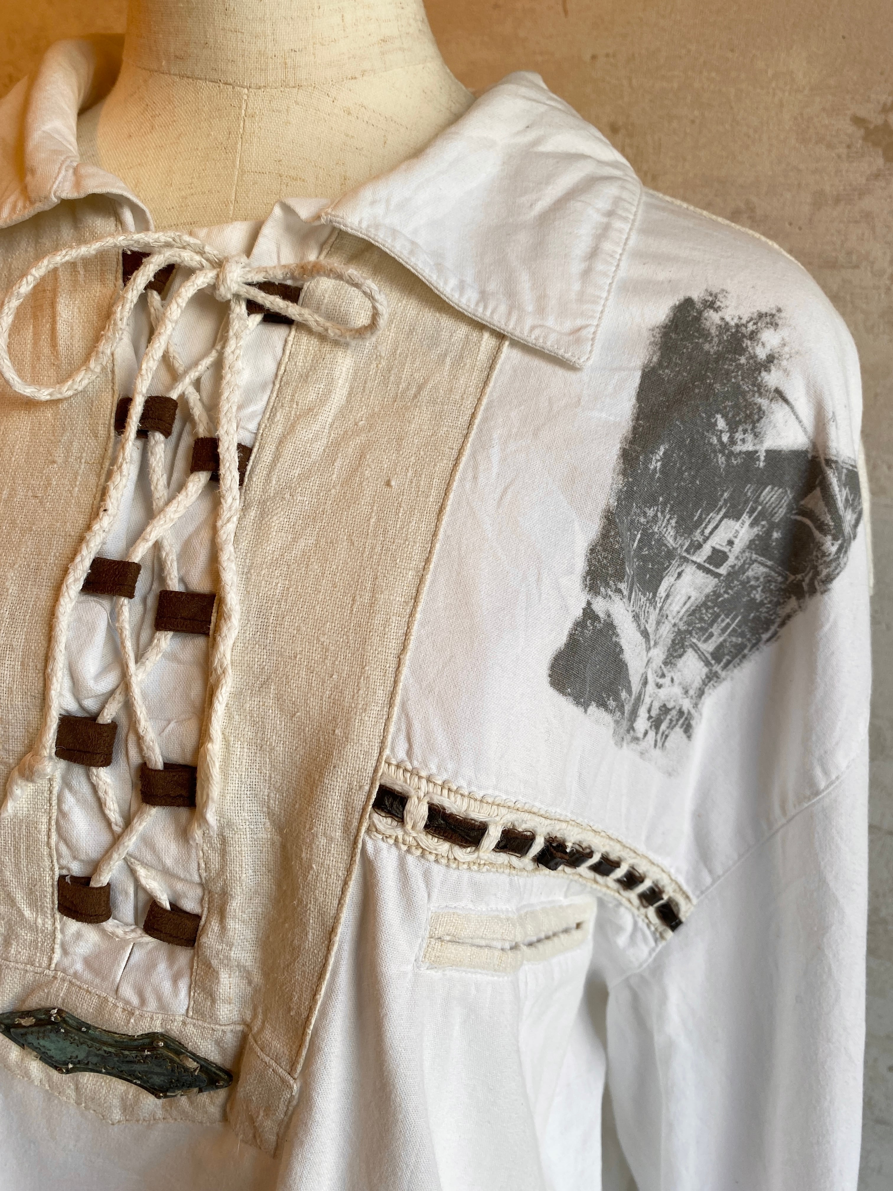 胸元の編み上げデザインや転写プリントが特徴的なこちら。前あきのシャツではなく、珍しいプルオーバータイプです。